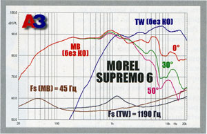 Смотрим на основу основ — АЧХ компонентов Supremo 6 без фильтров, в самом неприкрытом виде. Сразу отмечаем низкую добротность мидбаса при работе в стандартном 35-литровом объёме (ранний и плавный спад на низах) и довольно заметный пик, связанный с формой диффузора (на 1 кГц). Выше этой частоты начинается плавный спад, и это значит, что, когда мы включим его через фильтр НЧ, результирующая АЧХ будет практически свободна от неожиданностей. АЧХ пищалки достаточно ровная (но только при установке «заподлицо» — иные варианты с крупными пищалками лучше и не пробовать, ничего хорошего не получится), а с частоты 17 кГц начинается не слишком крутой, но определённый спад. Из любопытства мы сняли АЧХ «чистого» мидбаса под углом к оси, как видно, до примерно 3 кГц направленность излучения выражена не сильно, это ценное знание пригодится тем, кто предпочтёт поканальное включение головок. Известно: для корректной суммарной работы АЧХ компонентов должна быть гладкой и предсказуемой как минимум на октаву в каждую сторону от частоты раздела. Если частоту выбрать 2 кГц, это требование выполняется. Здесь же приведены импедансные кривые компонентов. Можно заметить, как сказались технологические особенности мидбаса: очень, низкая индуктивность звуковой катушки, потому и не потребовалась компенсация в кроссовере, и очень низкое значение Qms по измерениям — всего около 0,9. Это — прямое следствие работы C.A.R.